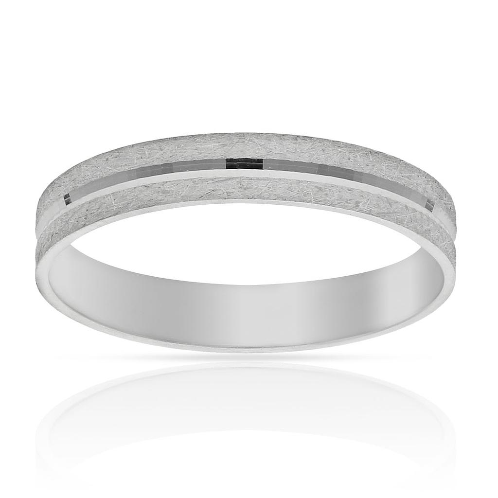 Alianza tallada medida 3,5mm. linea central en brillo espejo y bordes matizados en oro blanco de 18k.