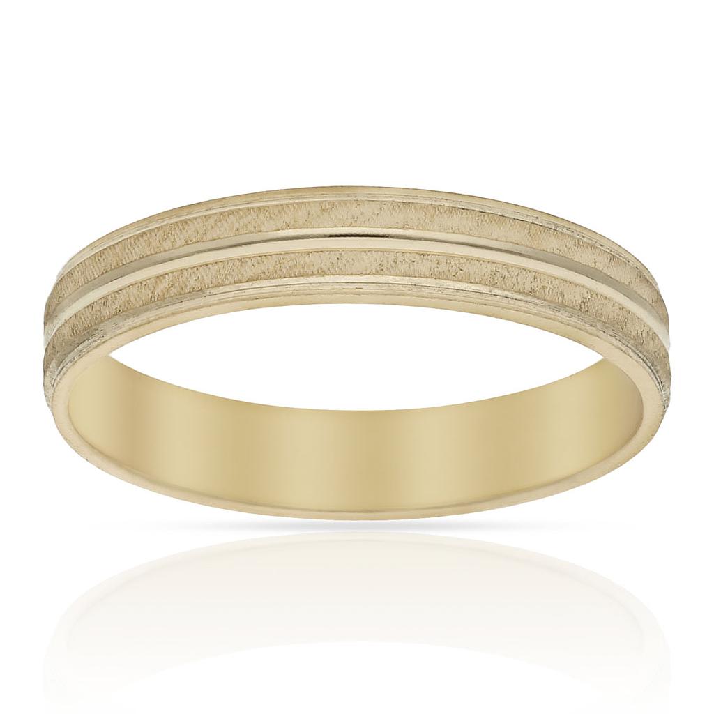 Alianza tallada medida 4mm. líneas brillo espejo y fondo matizado en oro amarillo de 18k.