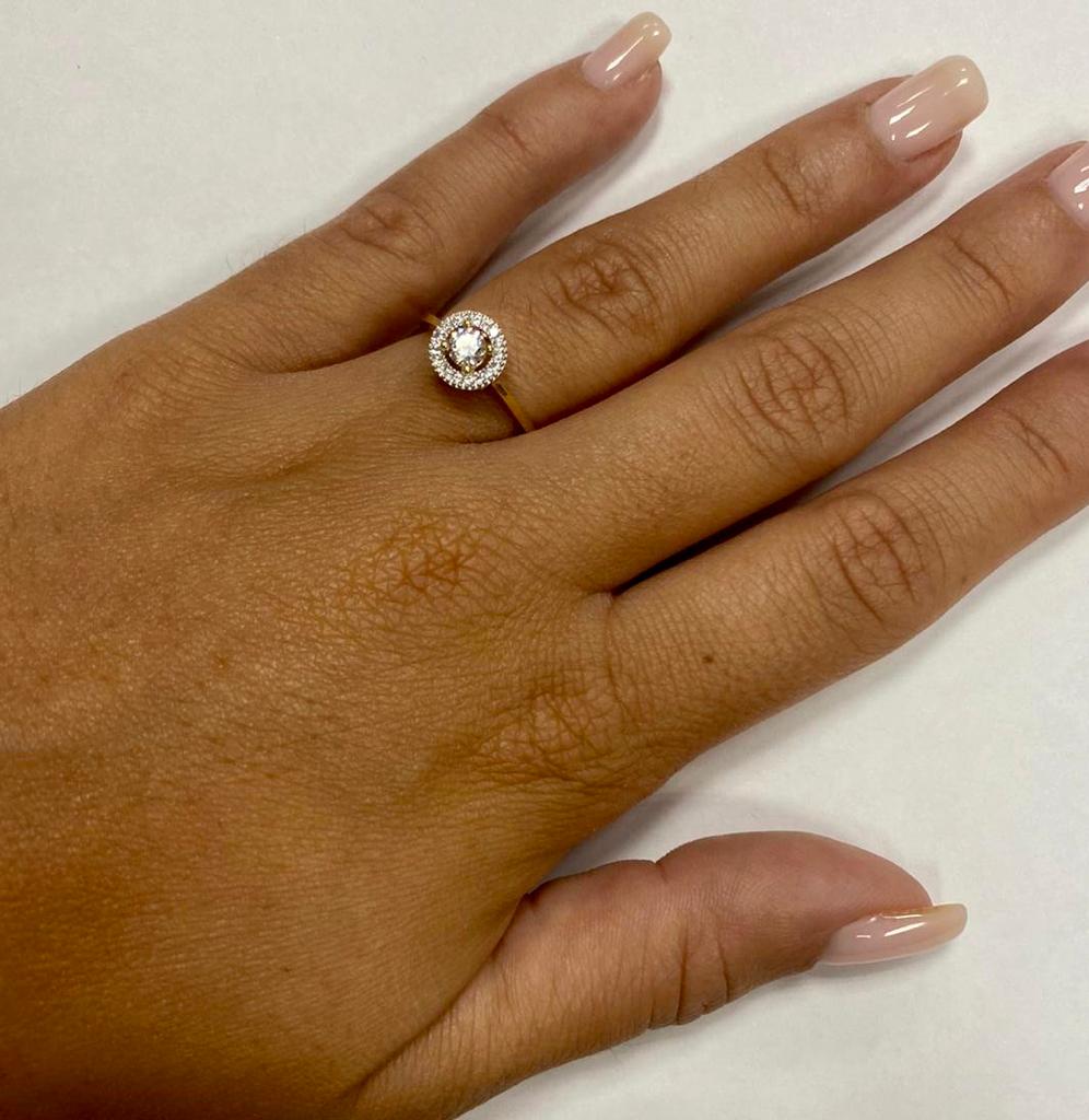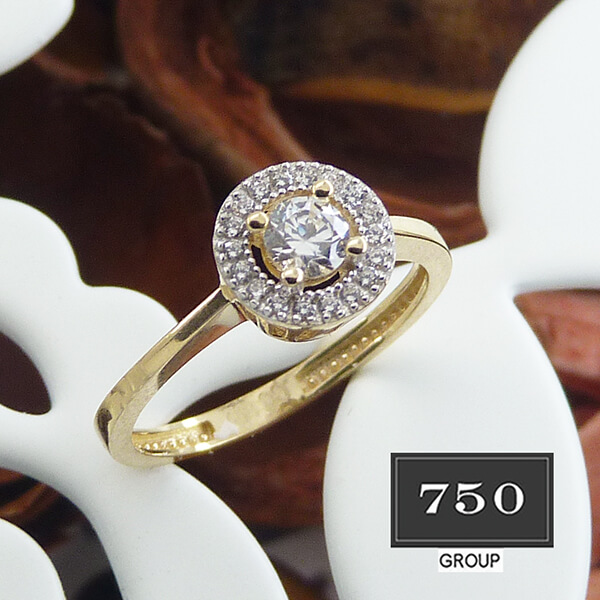 Anillo brillo liso con circonita con cuatro garras y circonitas mas pequeñas alrededor oro amarillo de 18k