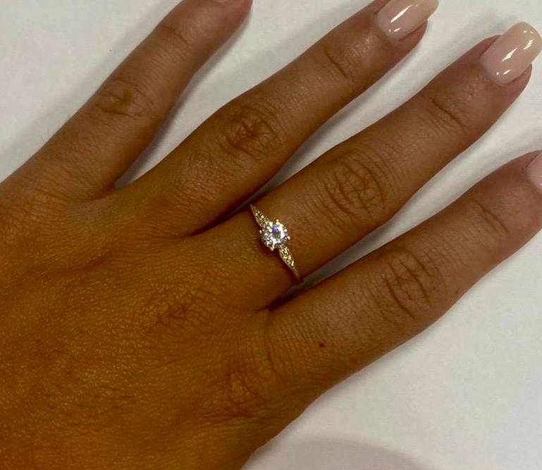 Anillo fino brillo espejo con circonitas y circonita central con 4 garras en oro amarillo de 18k.