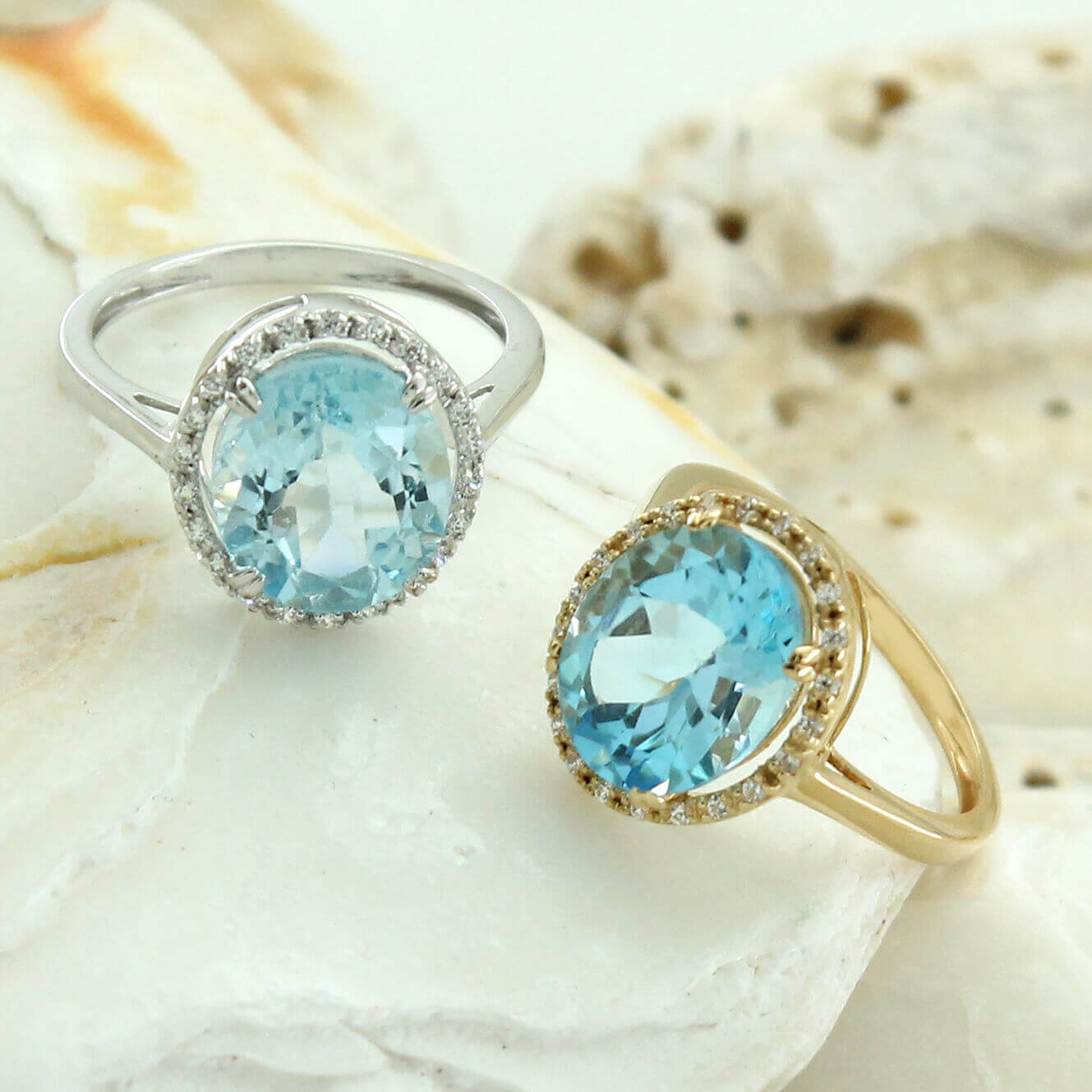 Anillo en brillo liso con topacio azul oval con medida de 12x8mm rodeado de circonitas, oro amarillo de 18k