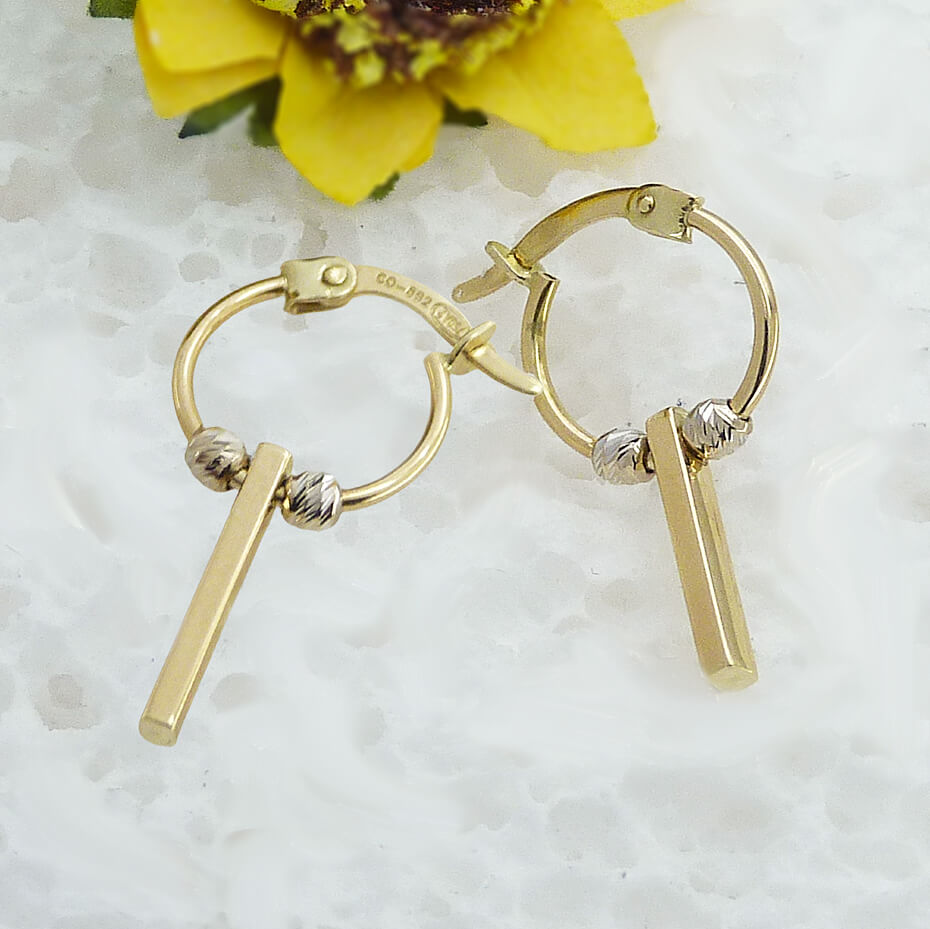 Pendientes aros bicolor con bolas en oro blanco y barra brillo liso oro amarillo 18k, cierre huggie