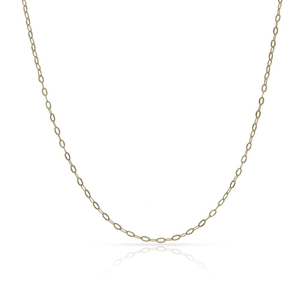 Cadena fina eslabón tallado hueco y plano con terminación en brillo espejo medida de ancho 1,2mm. y largo de 45cm. en oro amarillo de 18k.