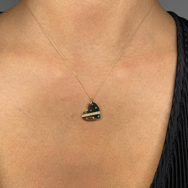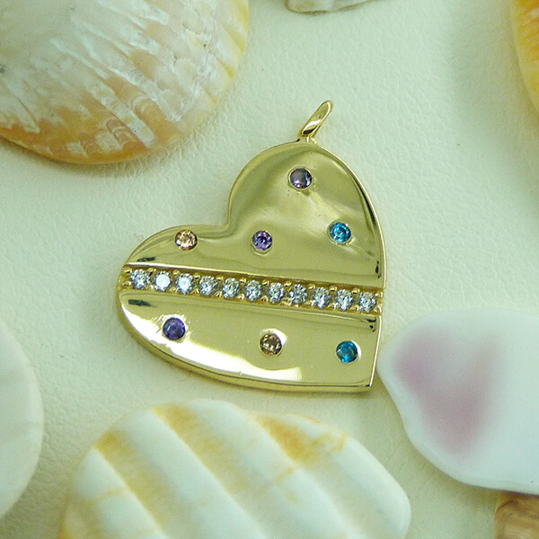 Colgante corazón brillo espejo con piedras de colores en oro amarillo de 18k.