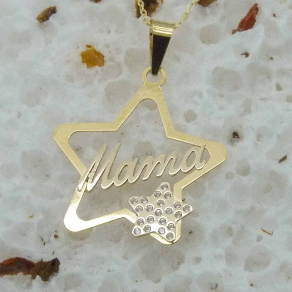 colgante en brillo liso con forma de estrella “mamá” medida 24 mm. con circonitas oro amarillo de 18k