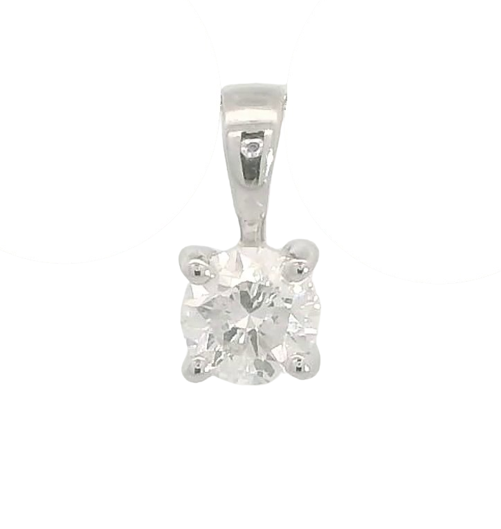 Colgante pequeño de diamante con garras medida 4mm y calidad del diamante: H-SI 1. 0.20 CT. terminación liso y brillo espejo en oro blanco de 18k.
