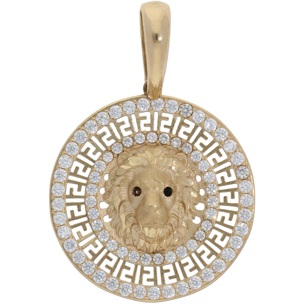 Colgante redondo con cabeza de león, ojos con circonitas negras, calado en greco y cerco de circonitas, medida de 27mm. de diámetro, en mate y brillo tallado oro amarillo de 18k.