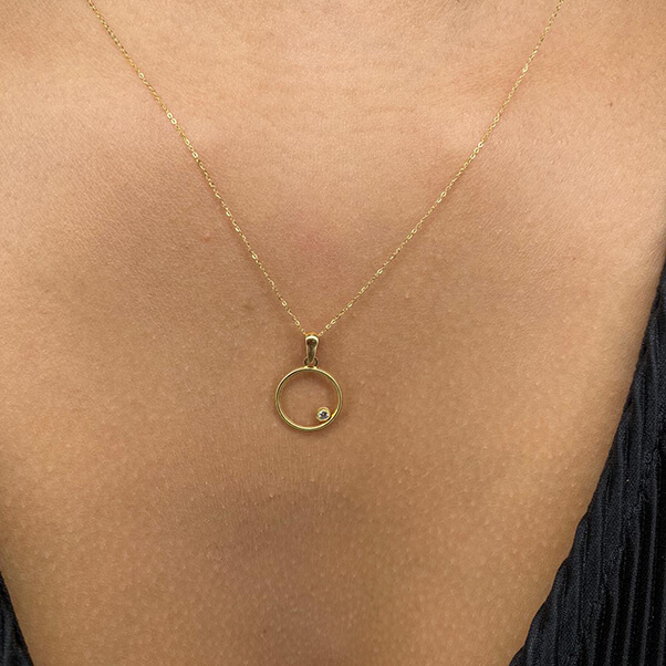 Colgante liso brillo espejo redondo con circonita medida13mm. en oro amarillo de 18k.