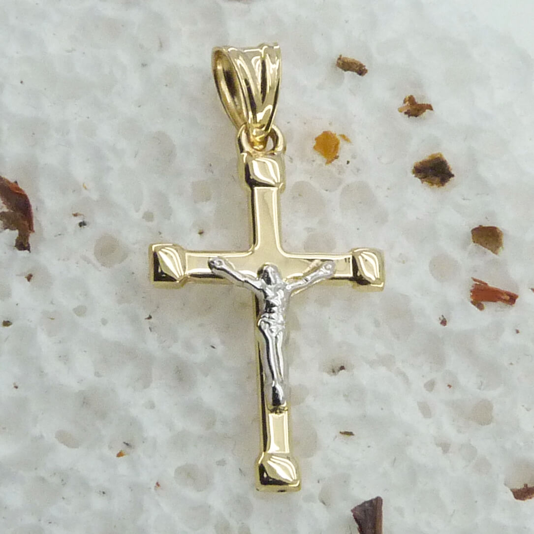 Colgate cruz bicolor con Cristo en oro blanco medidas de 28x17mm.oro amarillo de 18k