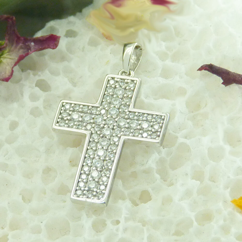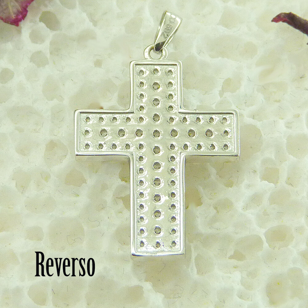 Colgante cruz brillo espejo con circonitas medidas 25x15mm. en oro blanco de 18k.