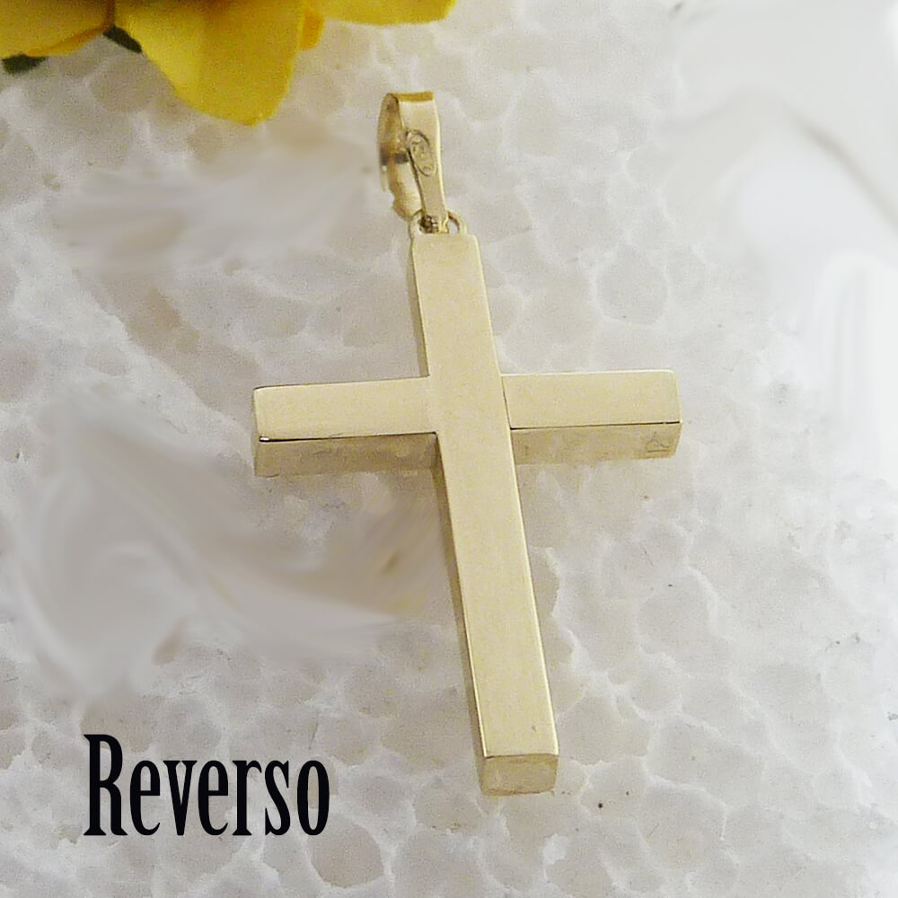 Colgante cruz reversible por un lado brillo liso y por el otro tallado medida 29x12mm.oro 18k