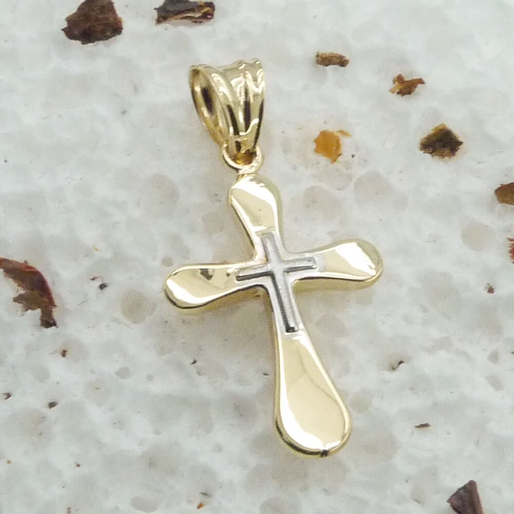 Colgante cruz reversible medida de 25x15mm.por un lado bicolor y por el otro oro amarillo de 18k