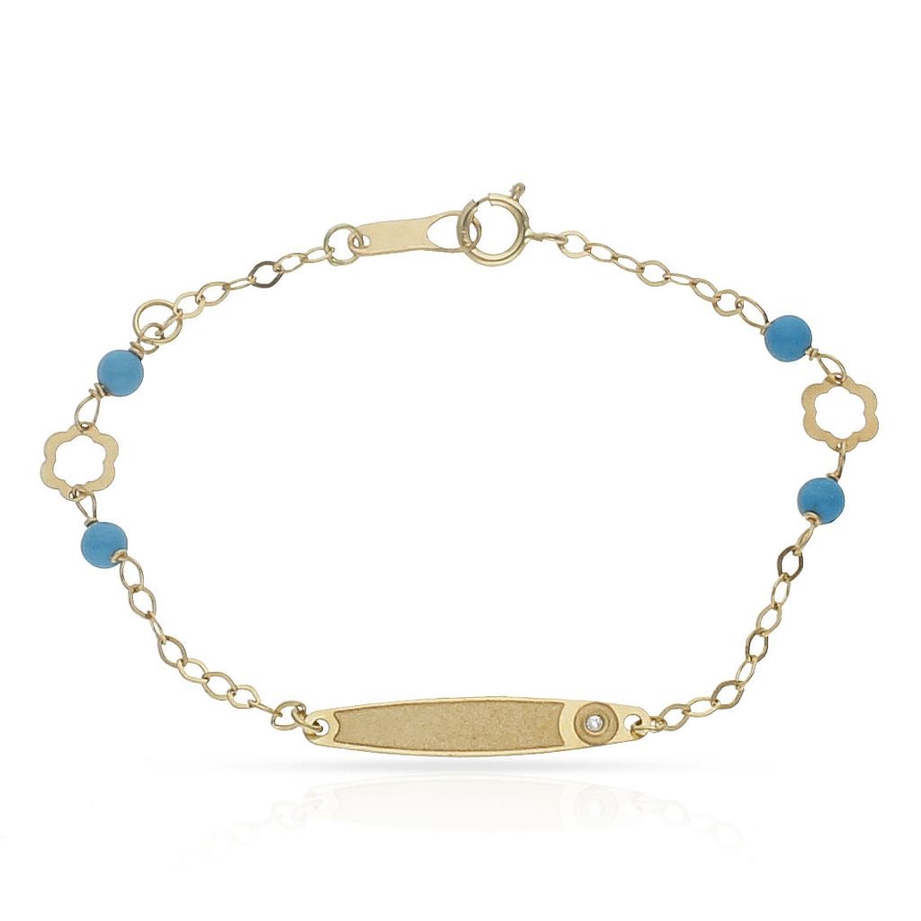 Esclava bebe en mate y filo en brillo con circonita, cadena de eslabones con turquesa sintetica y motivos florales, longitud de 14cm.en oro amarillo de 18k