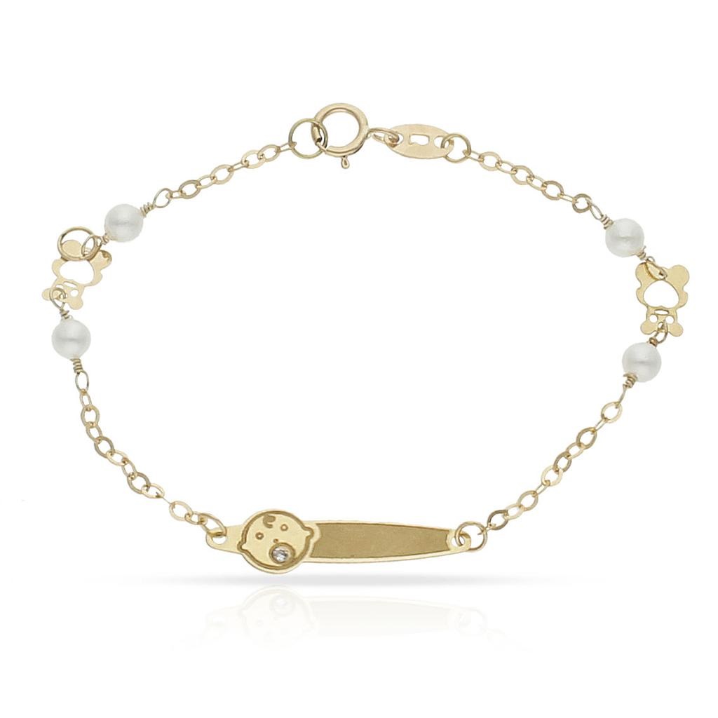Esclava bebe en mate y brillo con dibujo de bebe y circonita en la chapa, cadena de eslabones con perlas y ositos, longitud de 14cm.en oro amarillo de 18k
