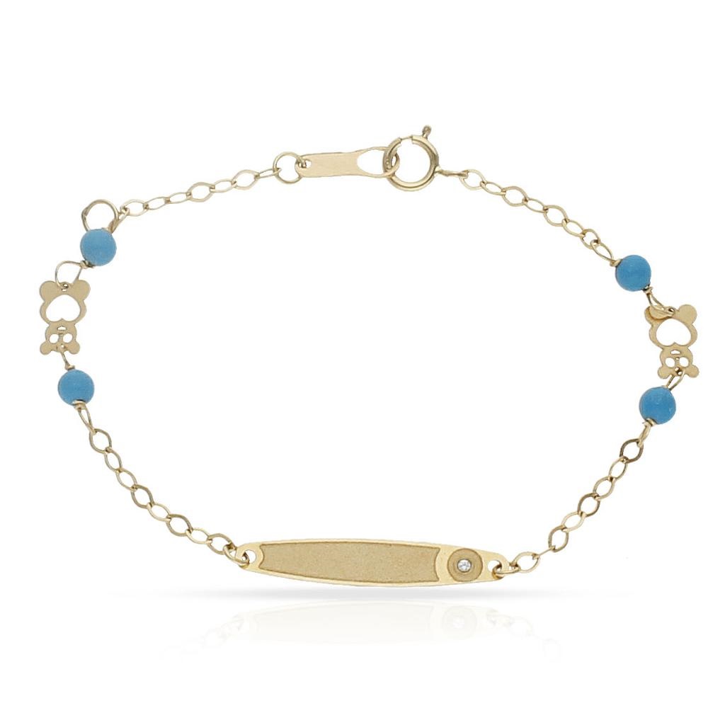 Esclava bebe en mate y brillo con circonita, cadena de eslabones con turquesas sinteticas y motivos de ositos, longitud de 14cm.en oro amarillo de 18k