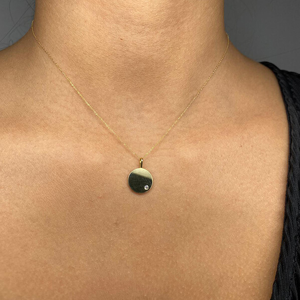 Gargantilla con colgante redondo liso con circonita, medida de 12mm.cadena fina de eslabones de 45cm. de largo oro amarillo de 18k