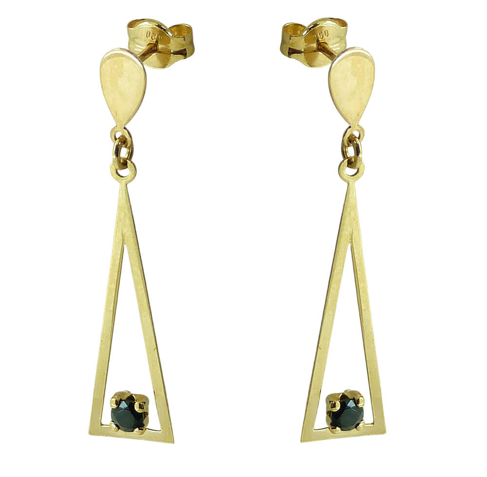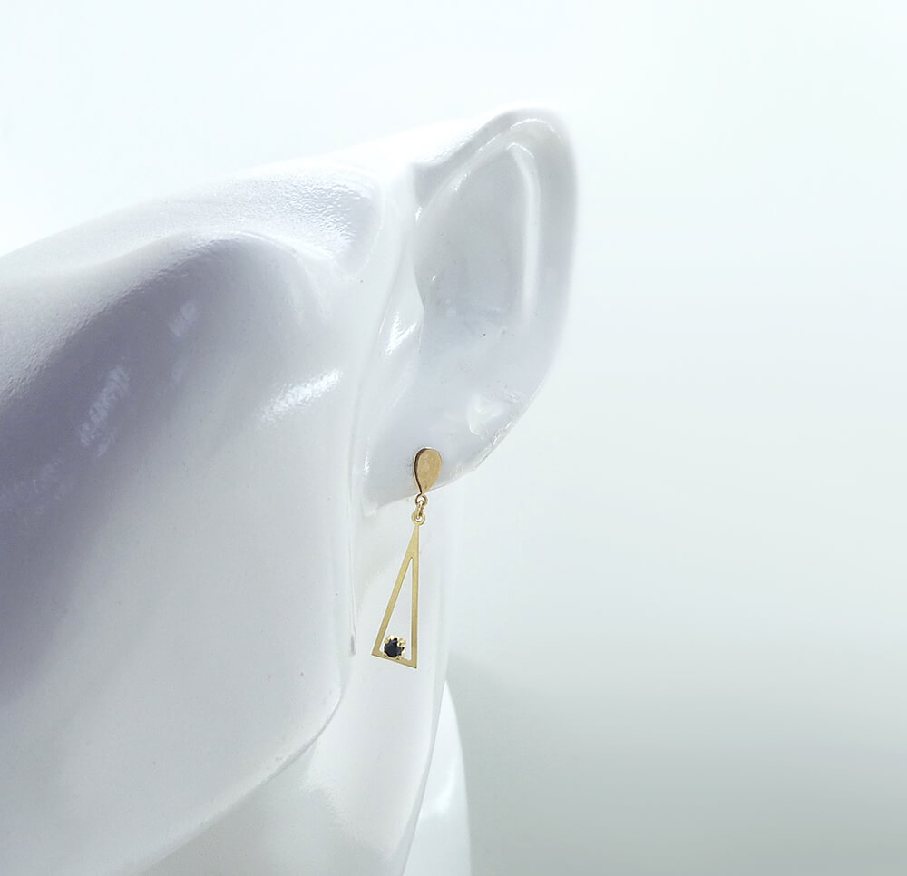 Pendiente triángulo gota y circonita negra medida 30mm. cierre de presión en oro amarillo de 18k.