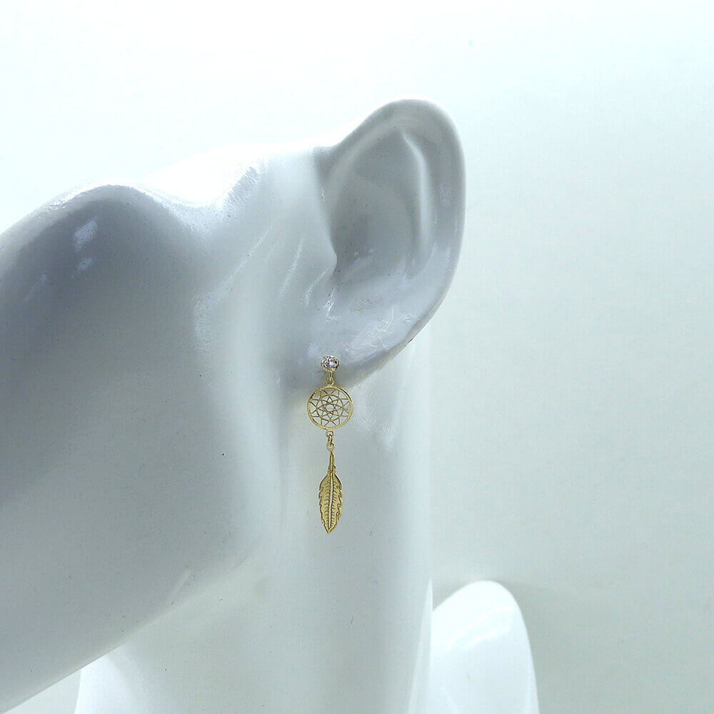 Pendientes atrapa sueños pluma tallada oro 18k