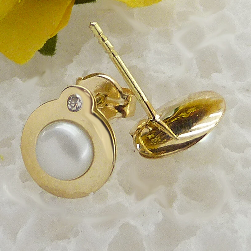 Pendientes de comunión brillo liso con perla y circonita, cierre de presión oro 18k