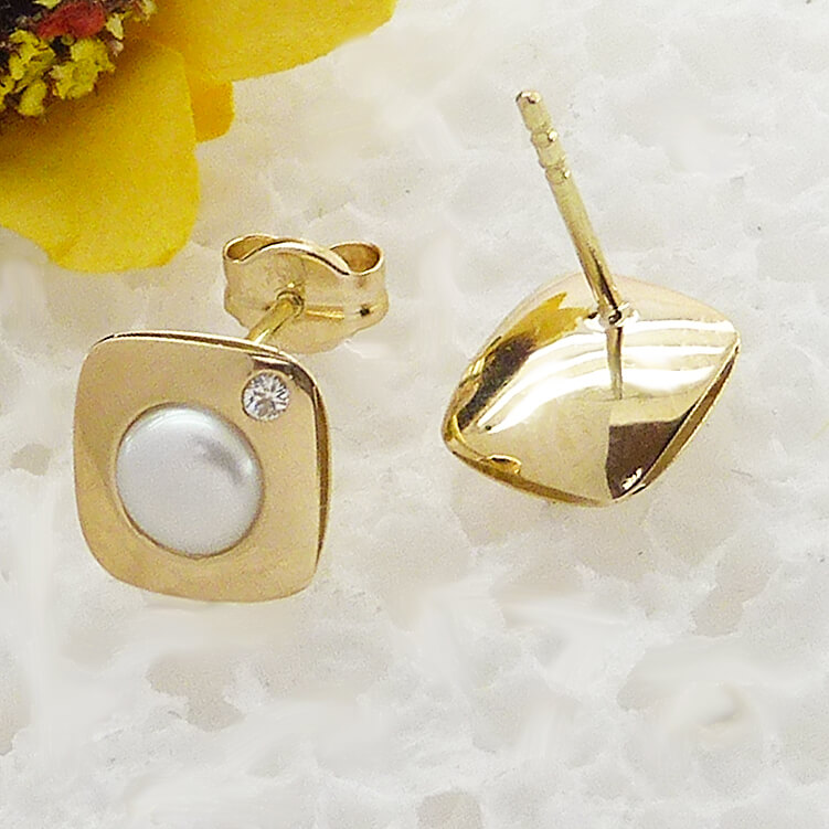 Pendientes comunión cuadrados brillo perla natural y circonita cierre de presión en oro amarillo de 18k.