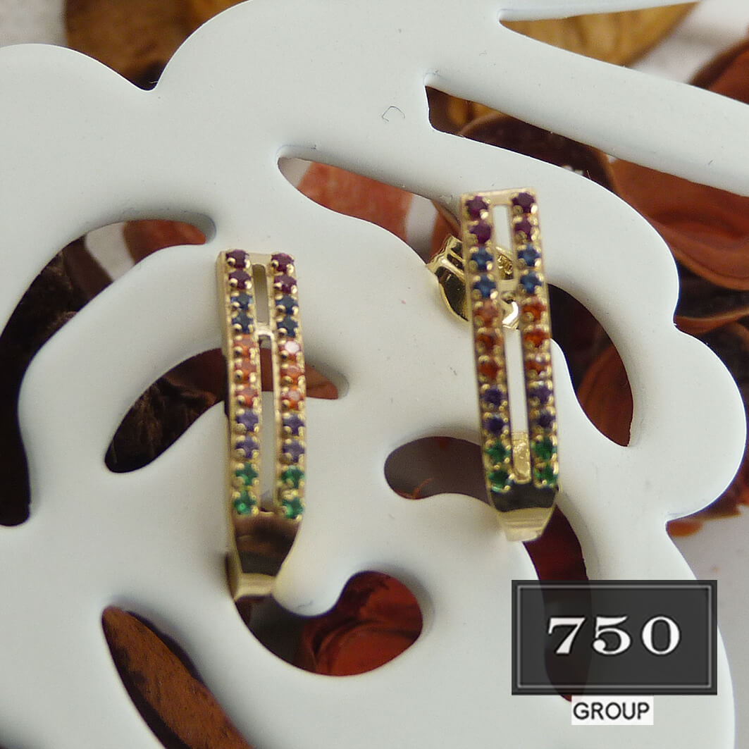 Pendientes de medio aro dobles con circonitas de colores, medida de 15mm, cierre de presión oro amarillo de 18k