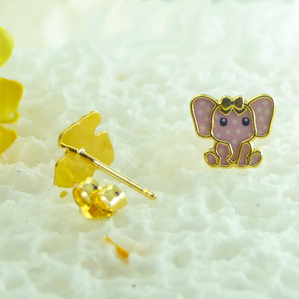 Pendientes elefante con esmalte rosa, medida de 7mm.cierre de presión oro amarillo de 18k