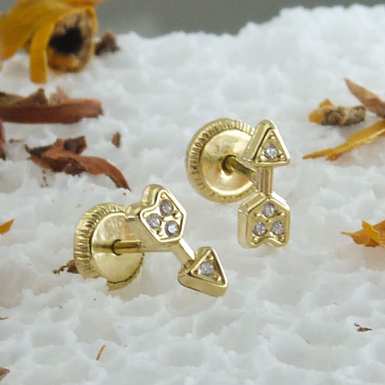 Pendientes mini flecha brillo espejo con circonitas medidas 8mm. cierre de rosca en oro amarillo de 18k.