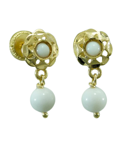 Pendientes arquillo bola color marfil tallados con cierre de rosca medida 15mm bebe y niña en oro amarillo de 18k.