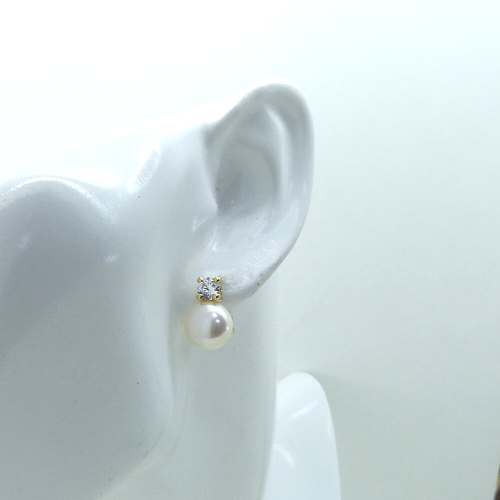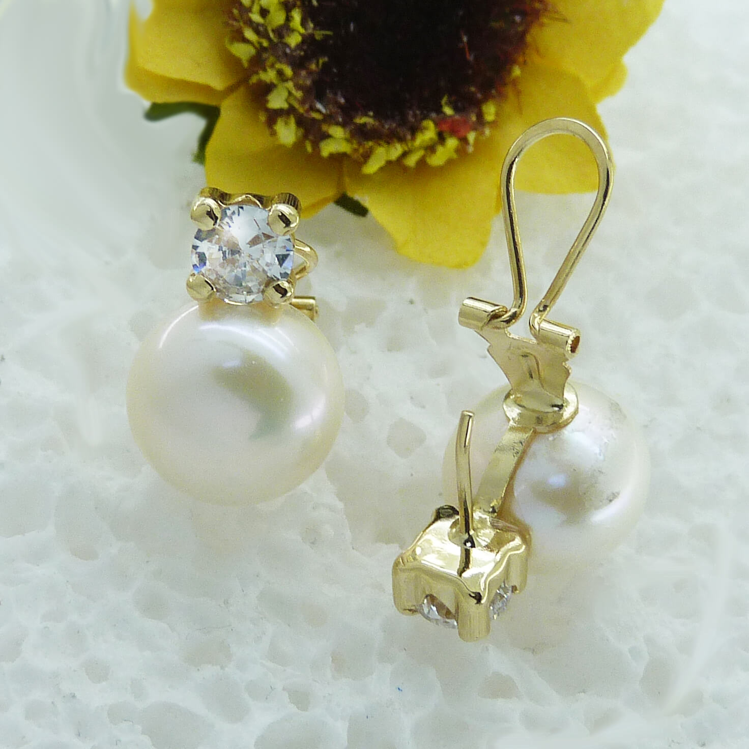 Pendientes perlas y circonitas 4 garras medidas 11-11,5mm. Cierre omega oro 18k