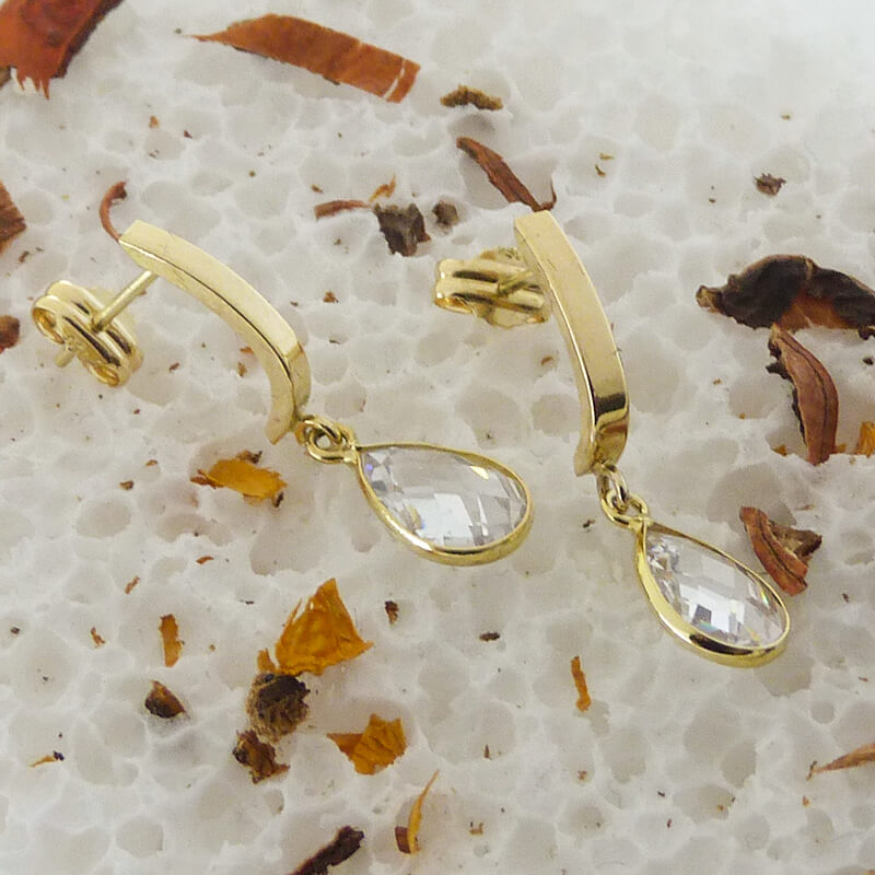 Pendientes banda en brillo con circonita lagrima medida 9x6mm.Cierre de presión oro 18k