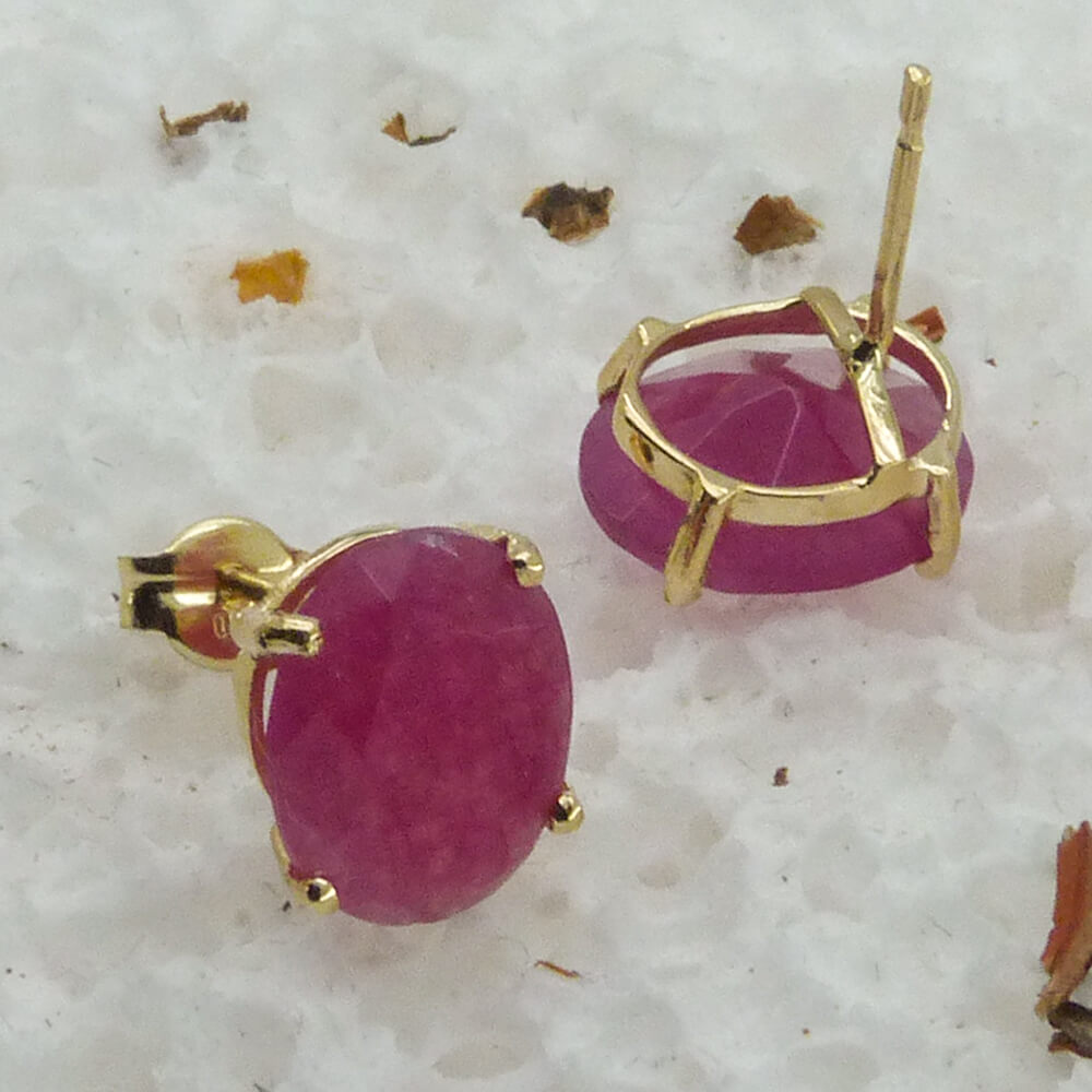 Pendientes 4 garras brillo con piedra color rubí oval de 10x8mm. cierre de presión en oro amarillo de 18k.