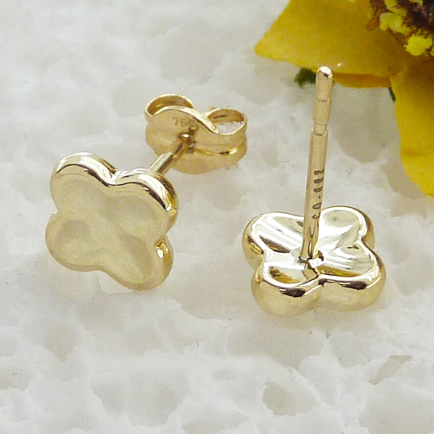 Pendientes trébol cuatro hojas lisos medida 7mm.cierre de presión oro 18k