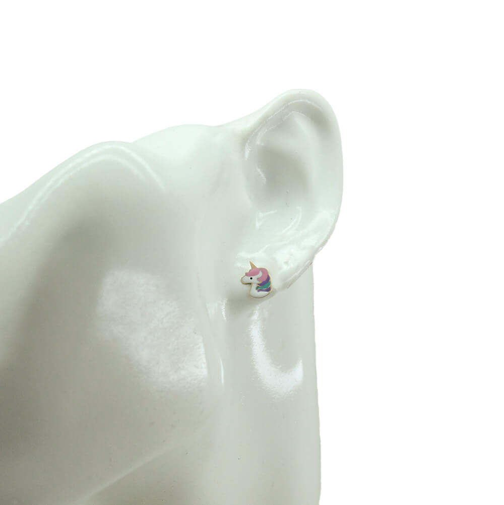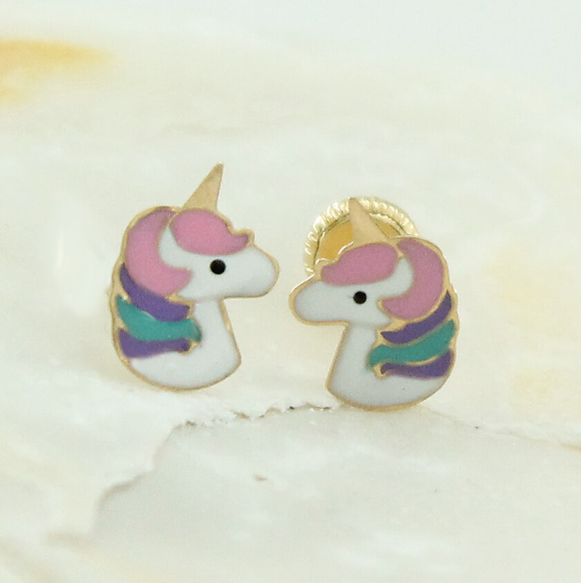 Pendientes niña unicornio esmalte cierre de rosca 8mm.oro 18k