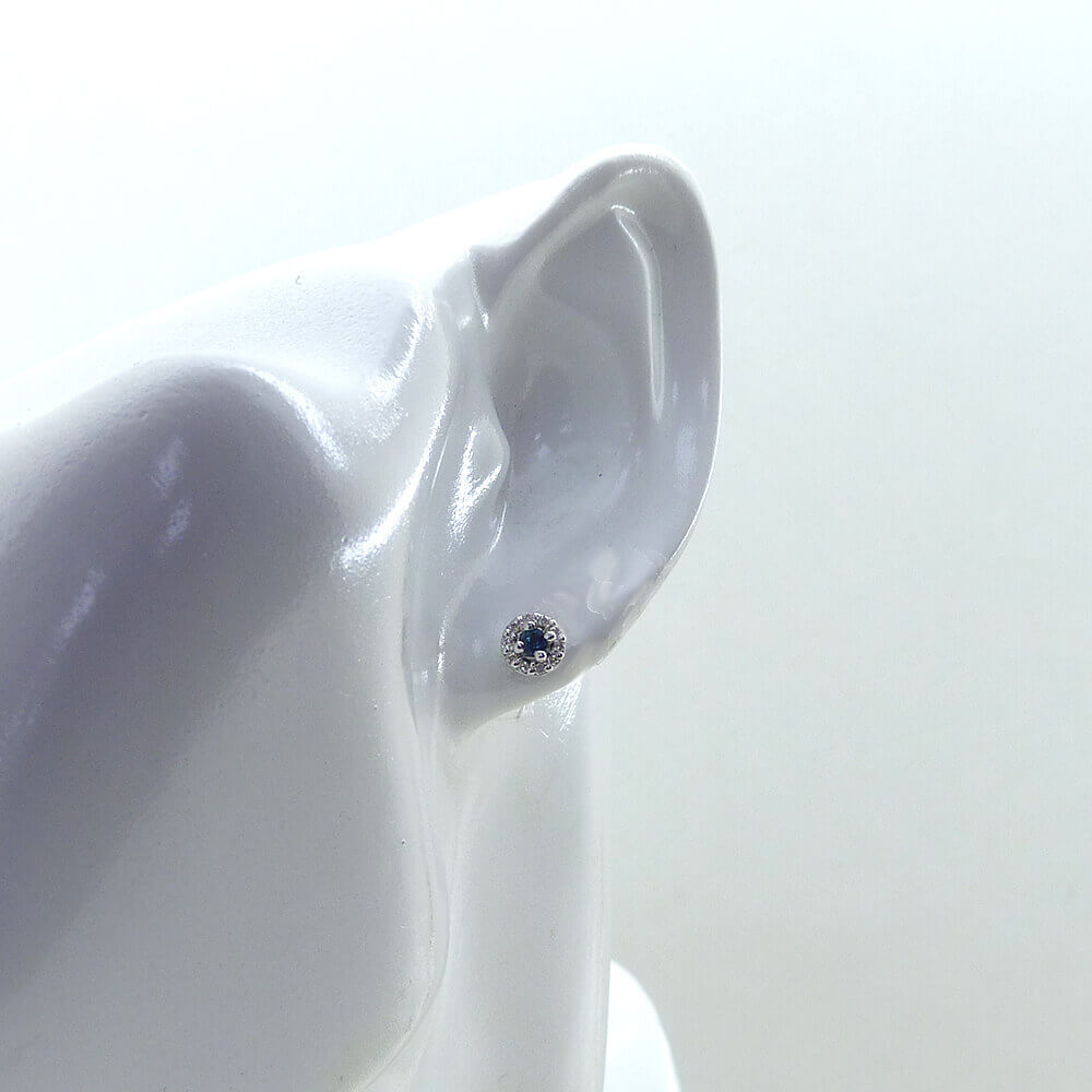 Pendientes zafiro con medida de 2’5mm y 20 brillantes con calidad H-SI. 0.10 ct tw. cierre de presión en oro blanco de 18k