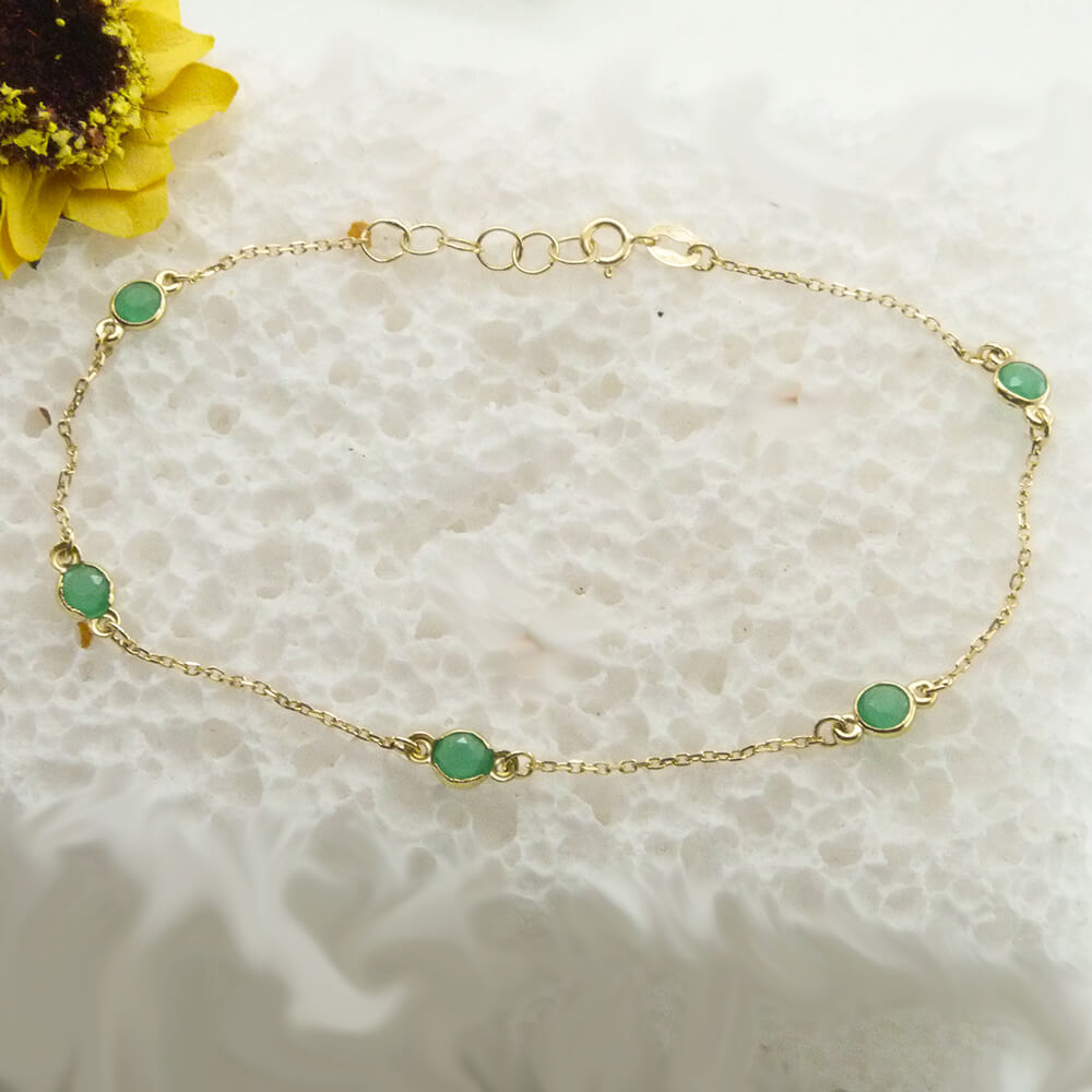 Pulsera 5 piedras color esmeralda cadena fina oro 18k