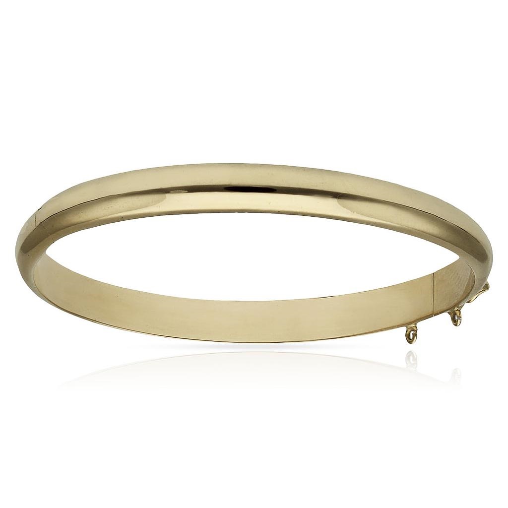 Pulsera media caña en brillo liso de 7mm.de ancho y 62mm.de diametro interior con cierre de lengueta y ocho, opcion de cadena de seguridad en oro de 18k
