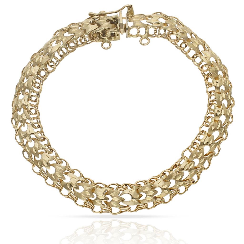 Pulsera modelo princesa de 9mm.de ancho y 19,50cm.de largo. Cierre de lengueta mas cierre de ocho y asas para cadena de seguridad en oro amarillo de 18k