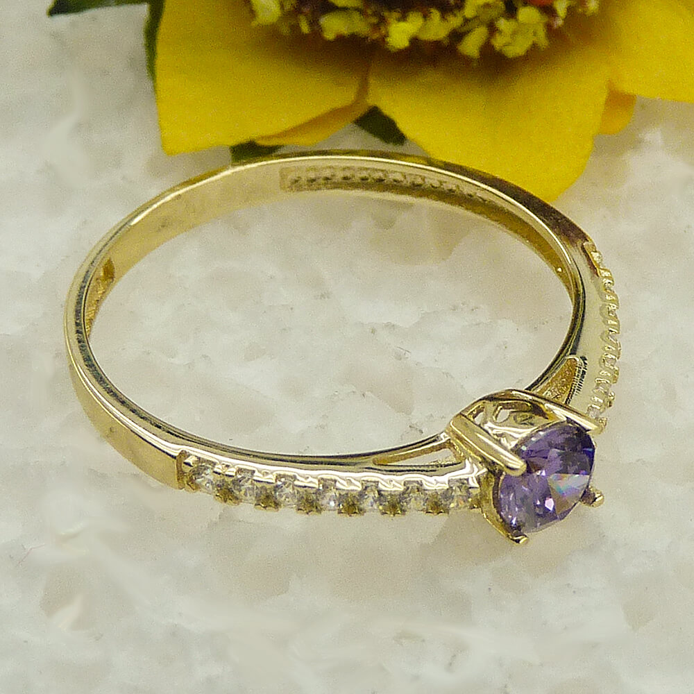Anillo 4 garras brillo espejo con circonitas blancas y circonita central color amatista en oro amarillo de 18k.