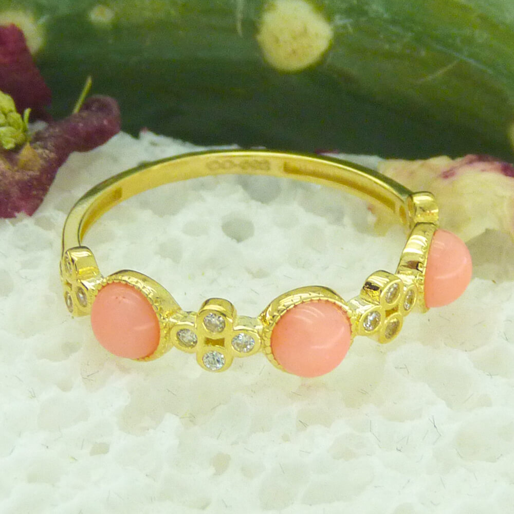 Anillo tallado circonitas con tres cabuchones rosas en oro amarillo de 18k.