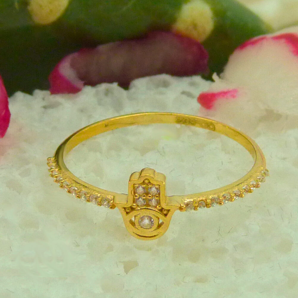 Anillo fino brillo con circonitas mano de Fátima (Hamsa) en oro amarillo de 18k.